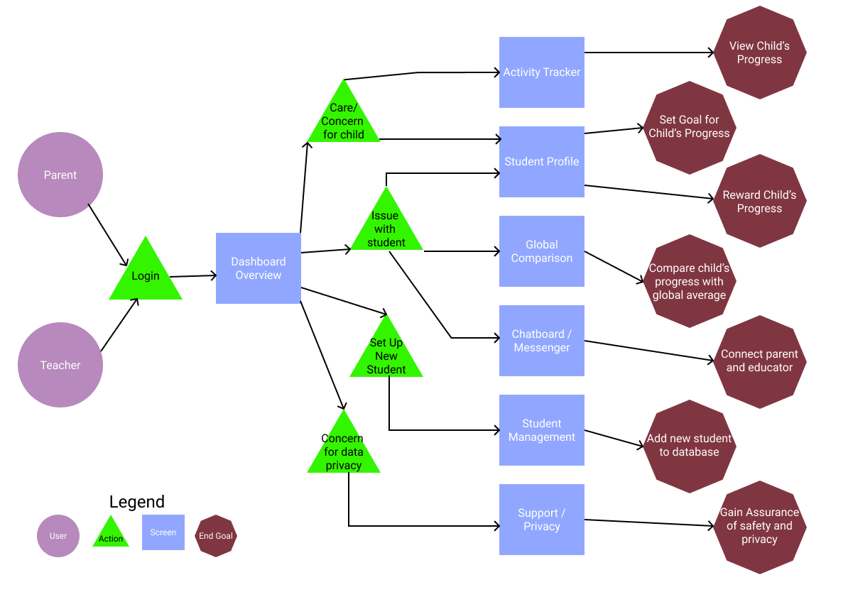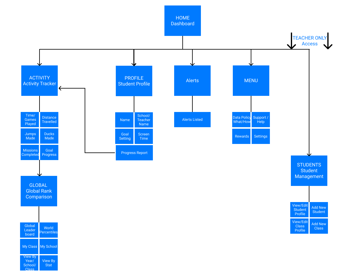 Site overview showing general content as well as relation of home, activity, global, profile, alerts, menu, and student screens.