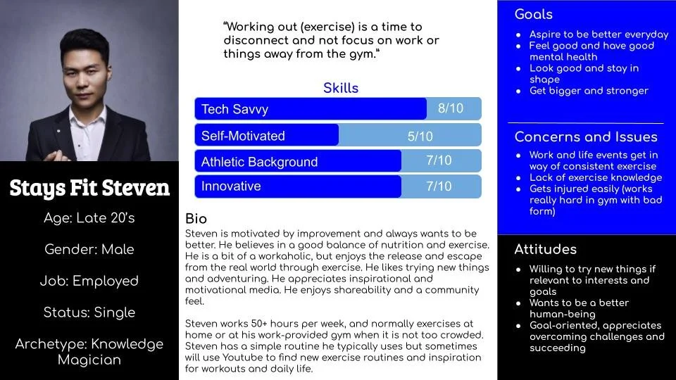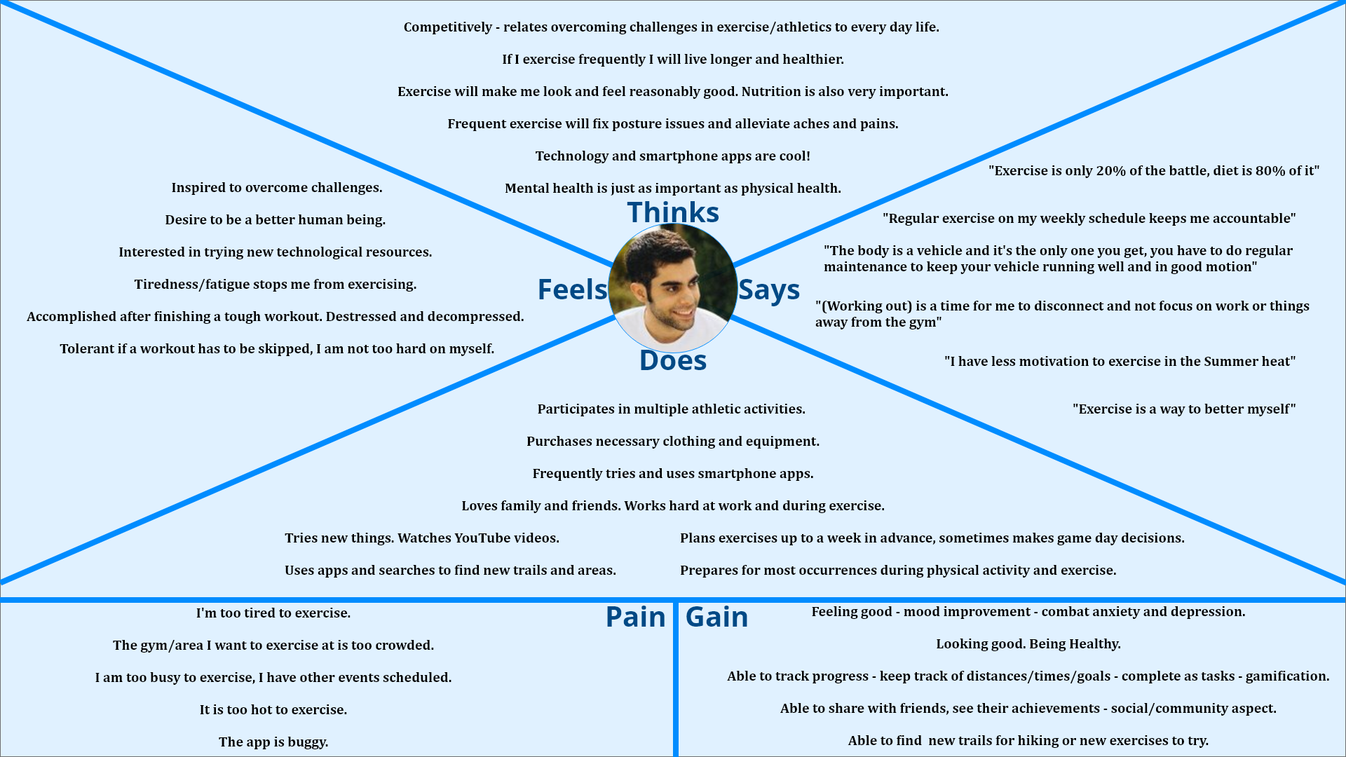 My name is Ryan Haar, and I am a UX/UI Designer. Being in charge of this exciting fitness-based project, my role was finding primary, secondary, and market research, as well as developing user surveys and user interviews. These allowed me the pleasure of working with 17 volunteer participants who kindly opened up in conversation to discuss their reasons behind exercising regularly, their personal exercise habits, their goals of exercising, and finally to test our design prototypes in order to give valuable feedback for future design iterations of the product’s development.
