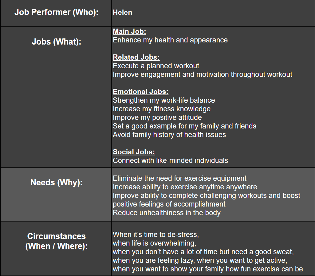 With the four common themes of the affinity map and the information gained from the empathy map, a jobs to be done framework was created in order to better explain
